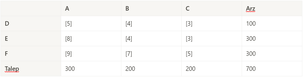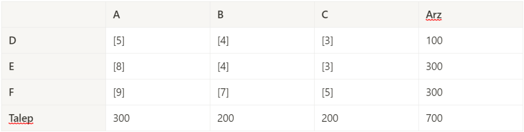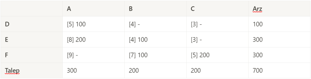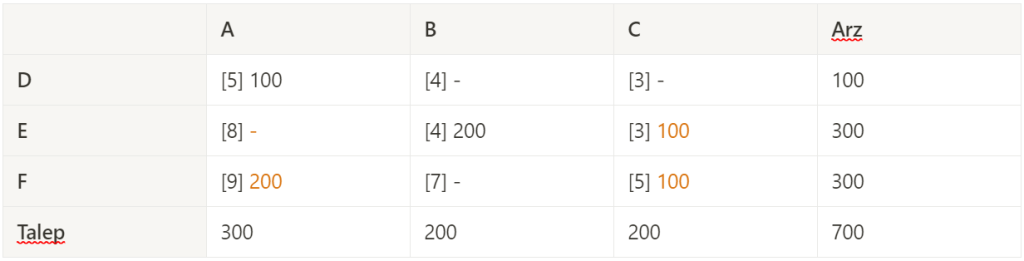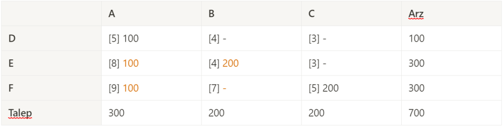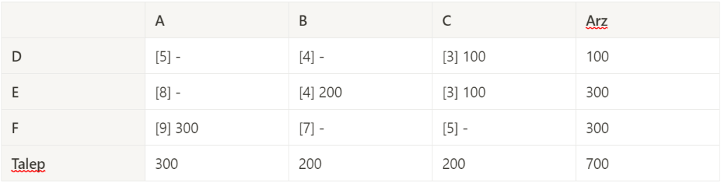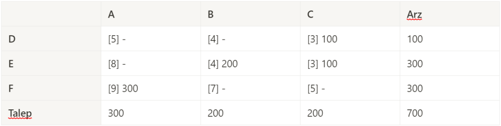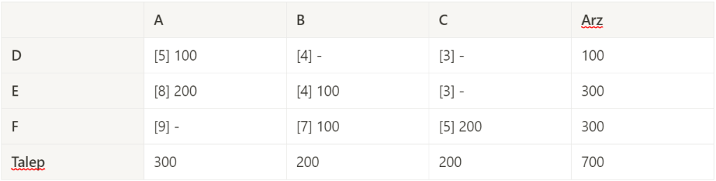 Tüm tablodaki minimum maliyetli hücreden başlayarak maksimum atama yaparak ilerliyoruz.