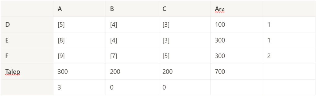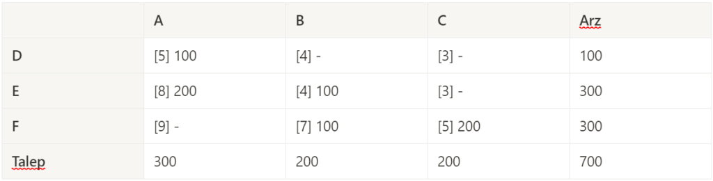 İlk satırdan başlayarak minimum maliyetli hücrelere maksimum atama yaparak ilerliyoruz.