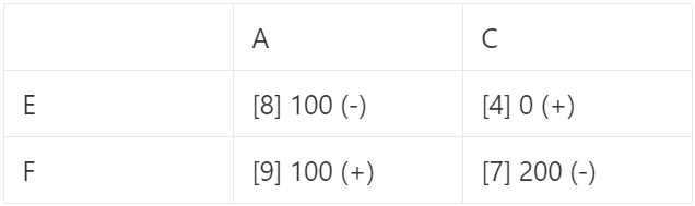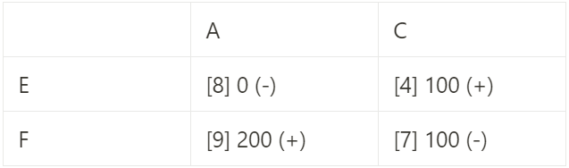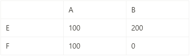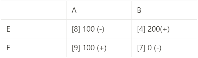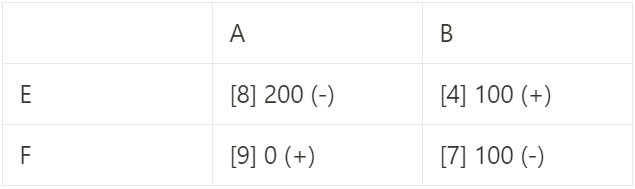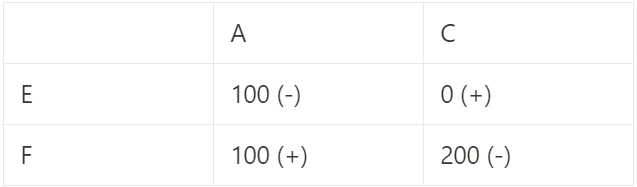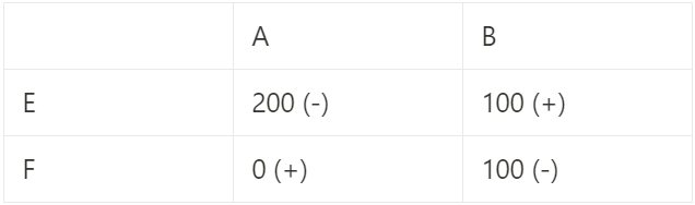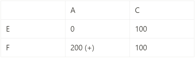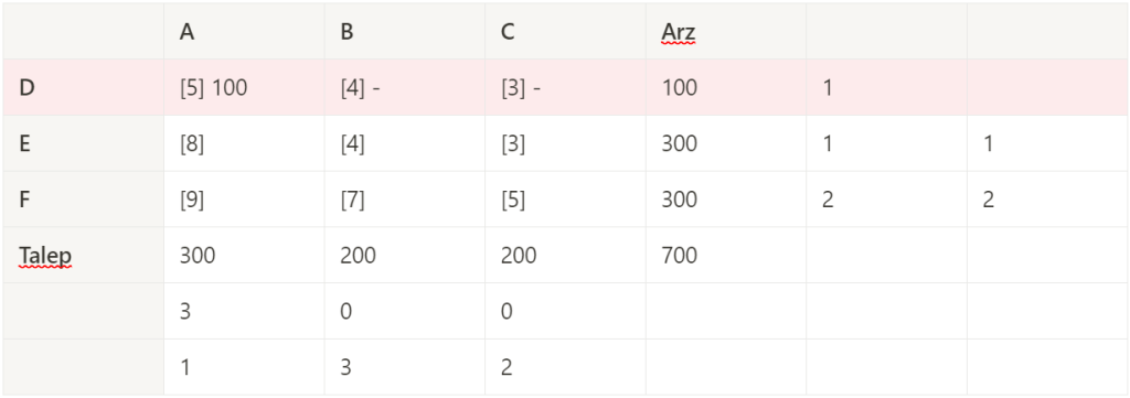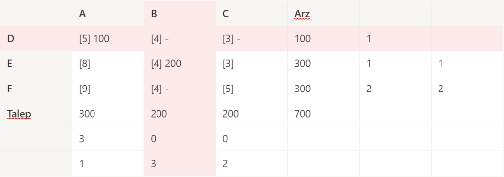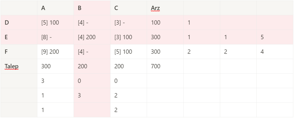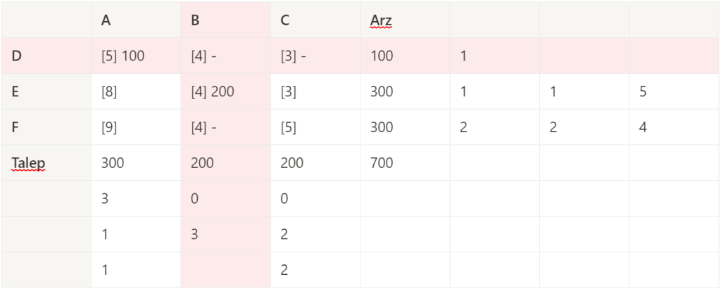 eksi olana hücrelerden (minimum olan değeri) çıkartıp, artı olan hücrelere ekliyoruz. Burada EA ve FB hücreleri eksidir. Çıkarılacak değer min(100,200) = 100 ‘dür. Bu durumda yeni değerler aşağıdaki gibi olacaktır.