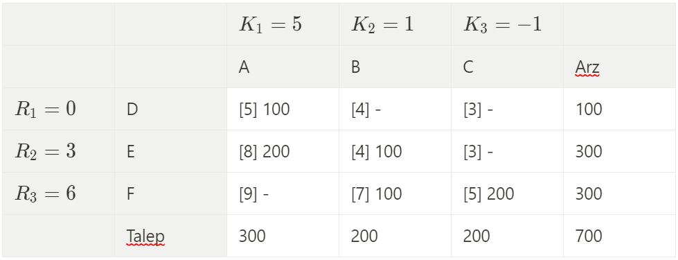 \begin{align*} &R_i:~i~satırına~ait~değer\\ &K_j:~j~sütununa~ait~değer\\ &c_{ij}~:~i.~satır~ve~j.~sütundaki~hücrenin~maliyeti \end{align*}