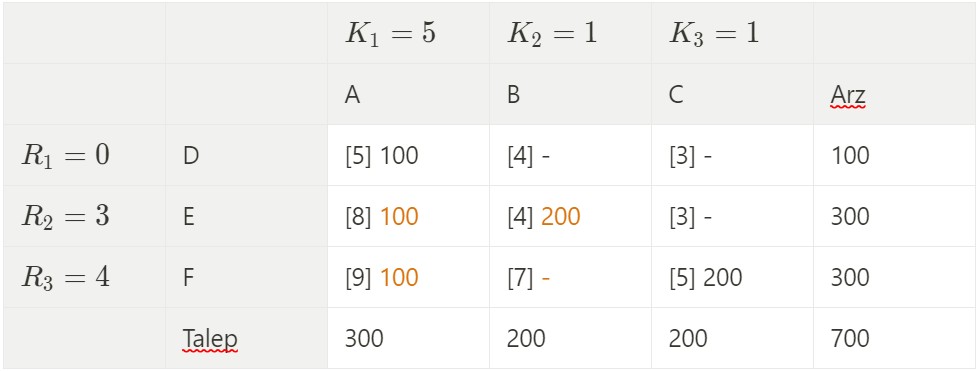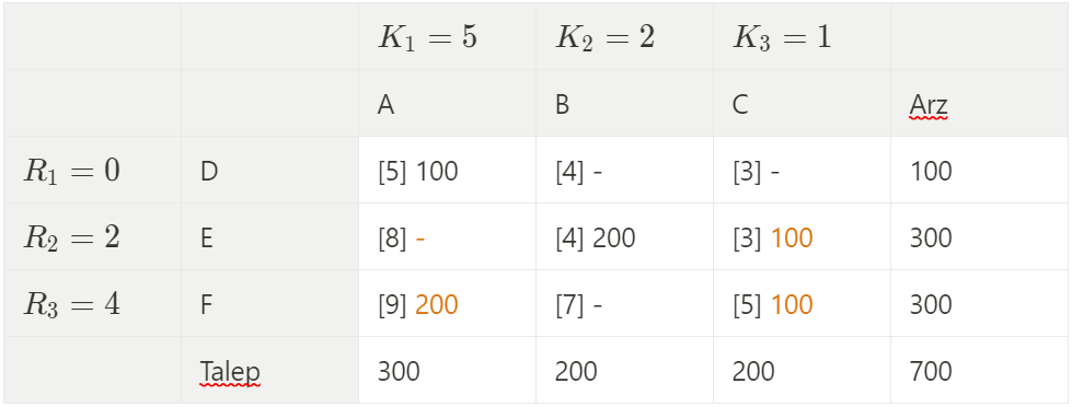 • Dolu hücreleriçin R_i+K_j=c_{ij} denklemleri belirlenir.