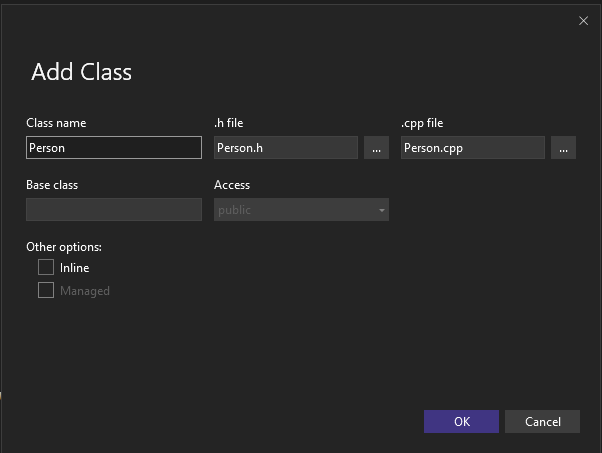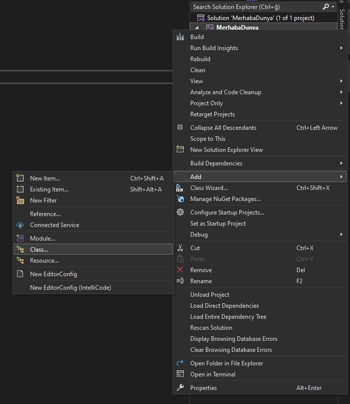 }Person isminde bir sınıf oluşturduk sonra main() fonksiyonunda 2 adet obje oluşturup kullandık. Şimdi Solution Explorer üzerinden projemize sağ tık->add -> new class diyerek yeni sınıf ekliyoruz.