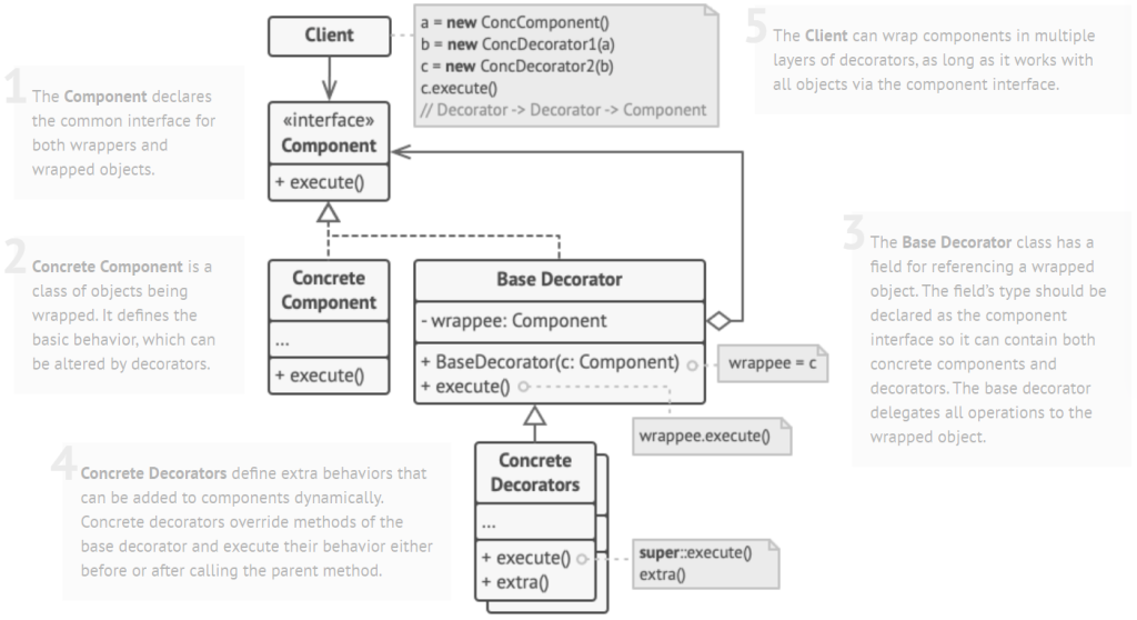 Decorator is a structural design pattern that lets you attach new behaviors to objects by placing these objects inside special wrapper objects that contain the behaviors.