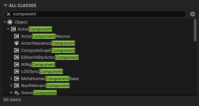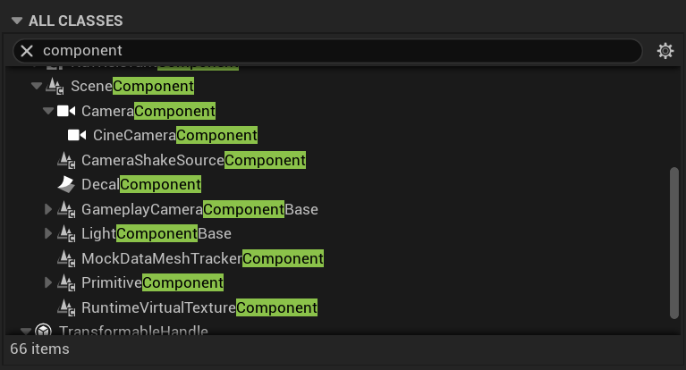 - SceneComponent : Transforma sahip olan şeyler için kullanılır. Sttaic mesh skeletal mesh vb şeyleri aratıp hangi componentin hangi grupta olduğunu inceleyebilirsiniz.